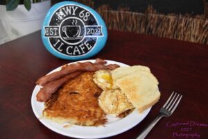 Your choice of 2 Bacon or Sausage Patty served with 2 Eggs, Hashbrowns, & Toast
